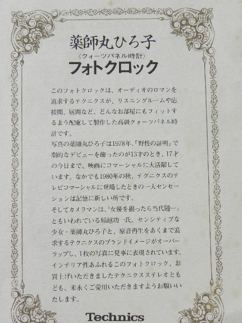 2017.10.3 薬師丸ひろ子 フォトクロック 価格:¥9,800(税込) 在庫数:1 商品説明 商品状態:中古箱サイズ:幅38×高さ39cm 1982年頃、テクニクスの販促用に作られたフォトクロック。ヘッドフォンから流れる音楽に涙する薬師丸ひろ子を撮影したのは稲越功一氏。元箱付の美品です。 商品についてのお問い合わせ お名前 (必須) メールアドレス (必須) 電話番号 問い合わせ内容 (必須) 上記内容でお間違いがなければチェックを入れて送信ボタンを押してください。